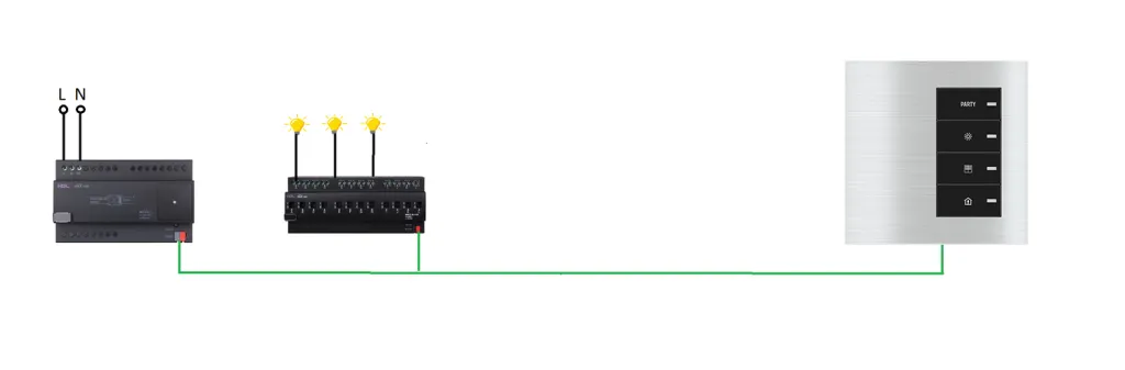Соответственно, клавиша пересылает команду переключения не через линию электропередач, а через электрический импульс в KNX кабеле.