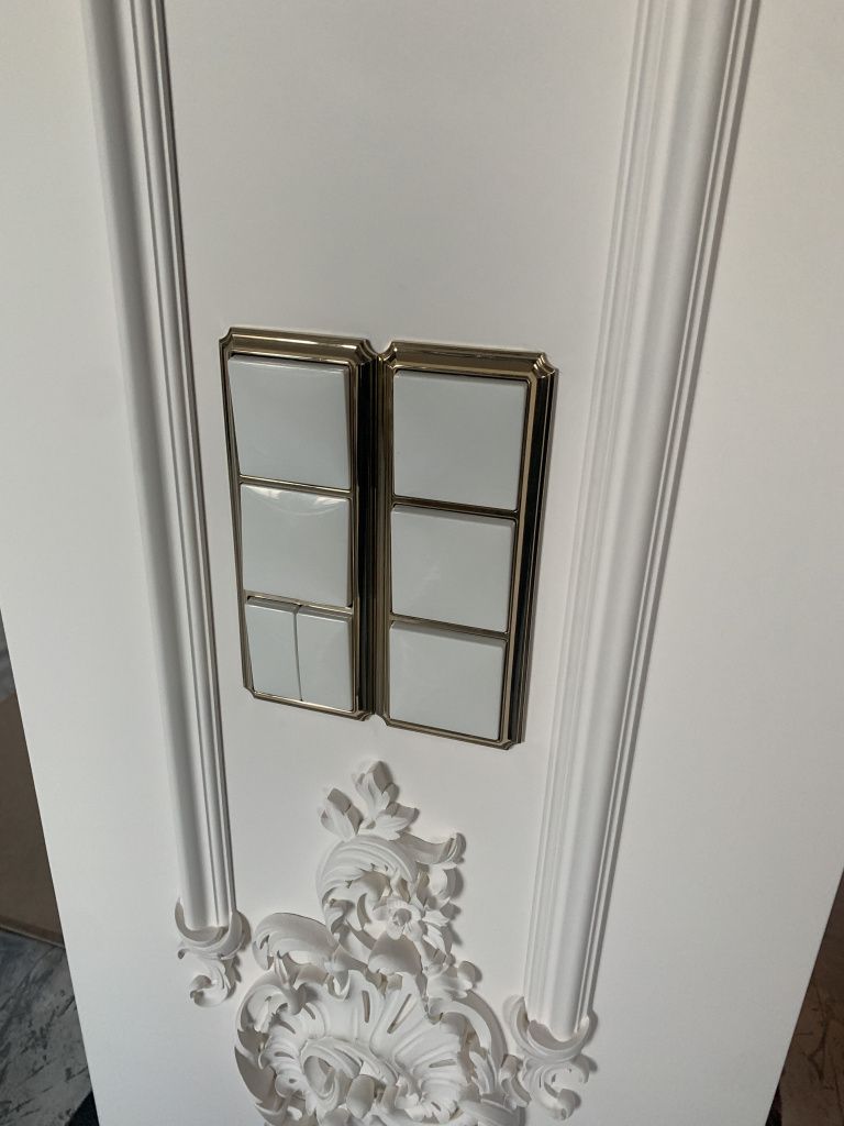 - Батарея выключателей. У нас 8 групп света, значит, будет 4 двухклавишных выключателя. Тут две проблемы:
