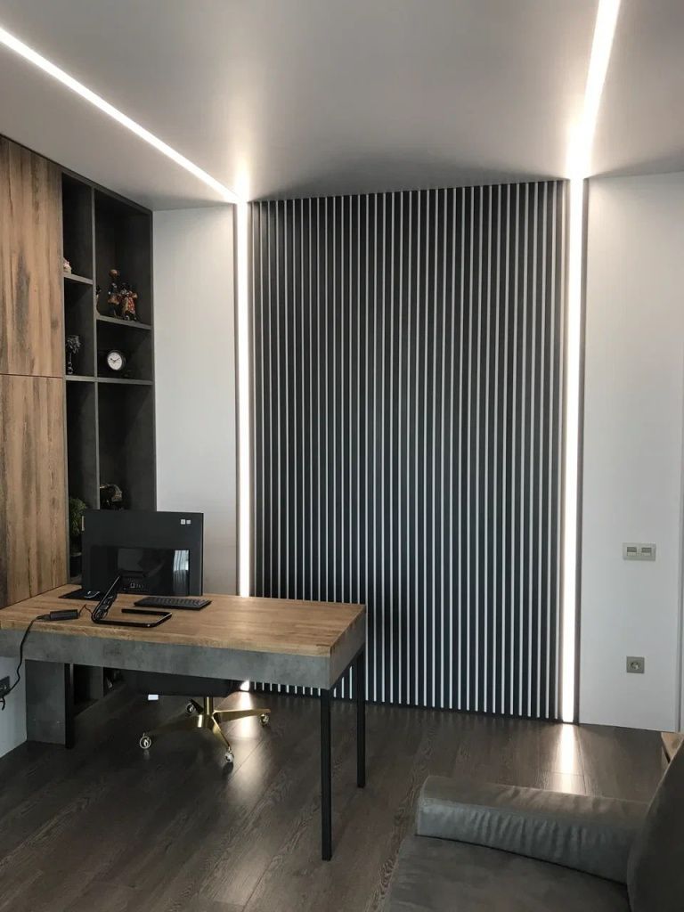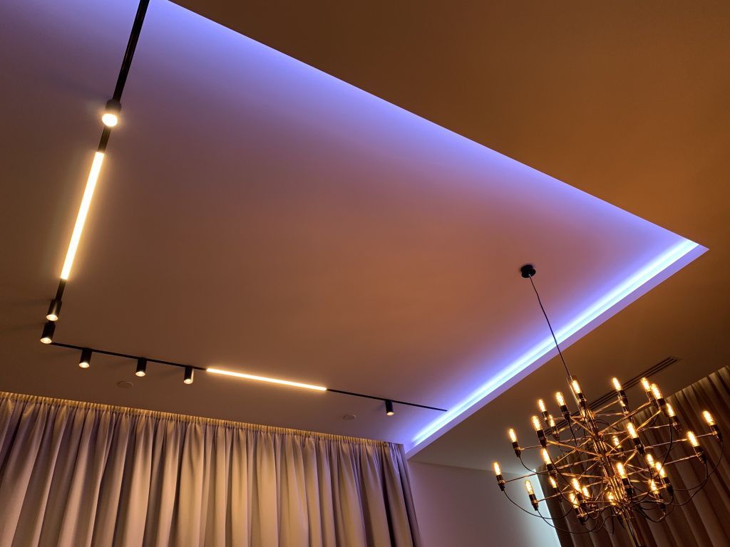 - Потолочная или декоративная подсветка выполняется при помощи лент 24В или 48В. Чем выше вольтаж устройства, тем ниже потери на проводе.