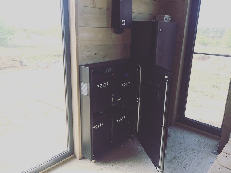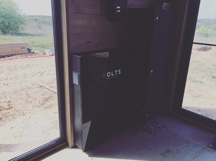 Общая площадь дома 200 м2, потребление электроэнергии 12-14 кВтч/сутки. Питание обеспечивает бойлер для подогрева воды, скважину с насосами для водоснабжения, освещение, холодильник, бытовую технику — в общем, всё, что необходимо для комфортной жизни. Для электрообеспечения в доме установлены накопитель VOLTS комплектации 10 кВтч (пять модулей емкости по 2 кВтч), 10 солнечных панелей по 250 Вт каждая, подключенные напрямую к накопителю. Энергонакопитель подключен в центральный распределительный электрощит, из которого уже идет распределение электроэнергии по дому.