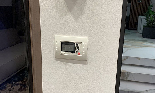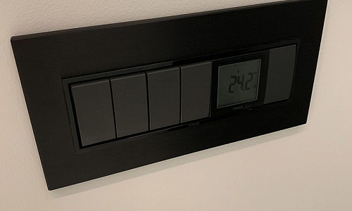 Контроллер VIMAR имеет клавишное управление, в качестве опции возможен заказ моделей с дисплеем. Под его управлением находится система кондиционирования, освещение и приводы управления шторами. Дополнительно предусмотрено наличие датчика, контролирующего качественные параметры воздуха.