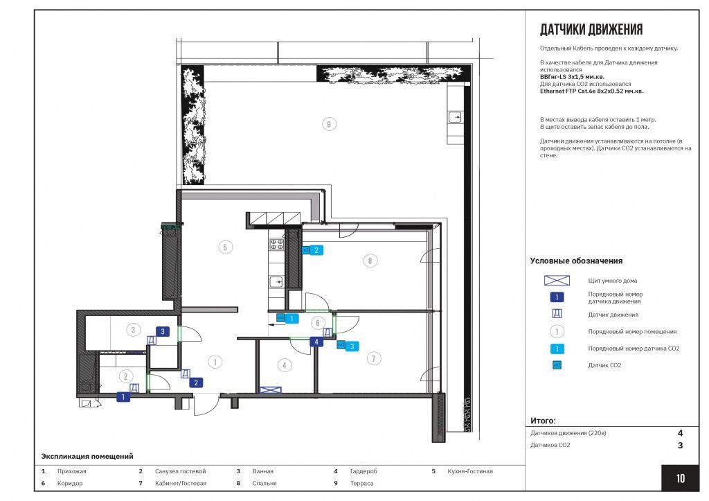Используемые датчики позволяют определять наличие в помещении человека, уровень естественной освещенности, выдавая соответствующие команды на исполнительные устройства. Аналогичным образом система климат-контроля получает информацию от датчиков для активации соответствующих сценариев.