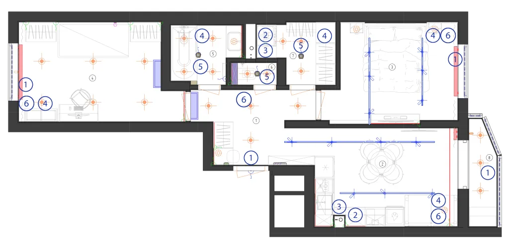 Созданы 23 световые группы по всему помещению, 7 из которых поддерживают регулировку яркости. В большинстве комнат установлены двухцветные LED-ленты, которые меняют температуру света в зависимости от яркости.