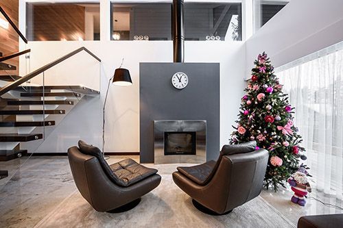 Особенностью этого проекта стали автоматически трансформирующиеся диваны, позволяющие максимально комфортно расположиться в гостиной хозяевам и их гостям, а также автоматические световые сценарии, создающие неповторимую атмосферу, гармонирующую с окружающей природой