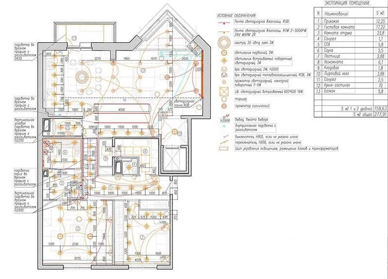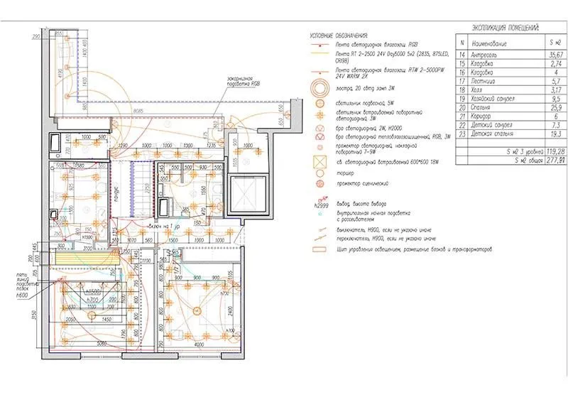 С учетом нестандартной планировки квартиры, превращенной в трехуровневую путем соединения двухуровневого жилья с отдельно приобретенной квартирой, потребовалось согласование проекта в надзорных органах и архитектуре при прокладке кабелей и выполнении иных работ, предполагающих воздействие на капитальные конструкции.