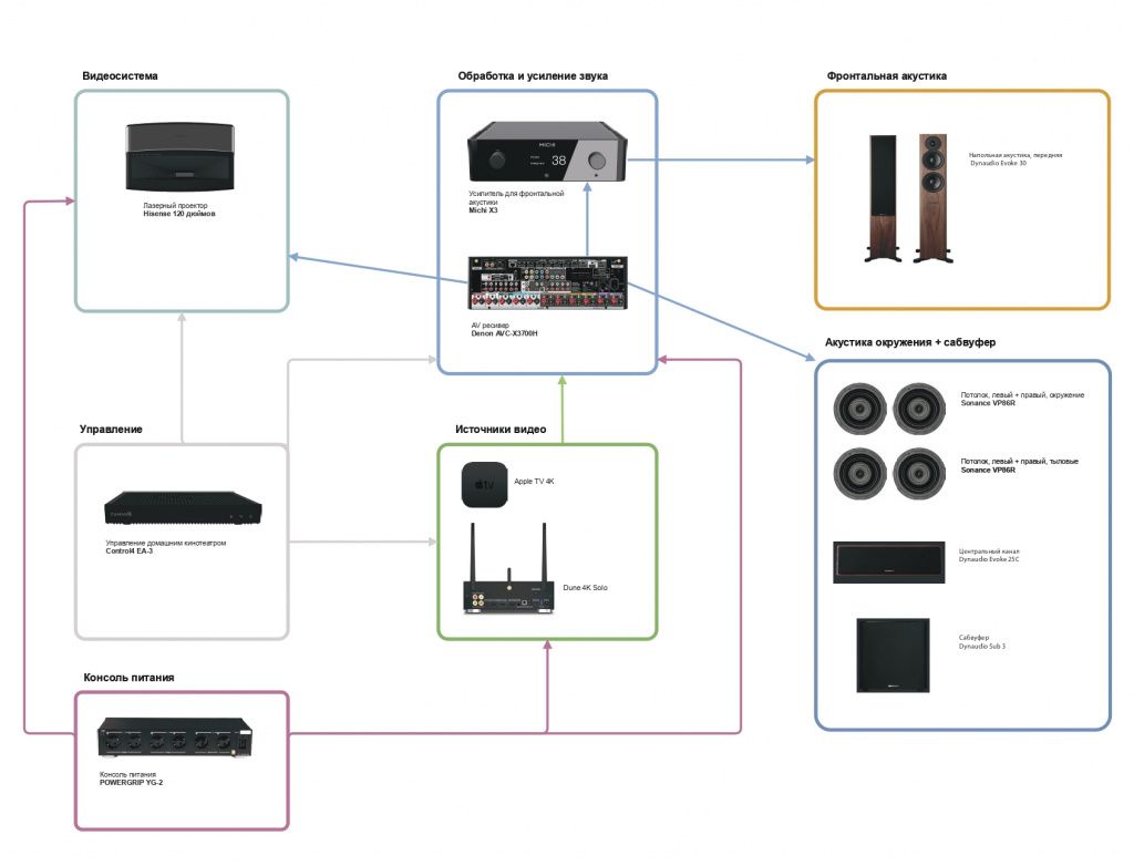 Домашний кинотеатр — это сложная система, состоящая из комплекса специализированного оборудования и инженерных решений, с грамотным сочетанием аудио и видеоаппаратуры, расчетами акустических параметров помещения, правильно подобранными материалами отделки, качественным монтажом и настройкой. При сочетании всех этих компонентов уютная гостиная может превратиться в настоящий личный кинозал с эффектом присутствия зрителя в фильме.